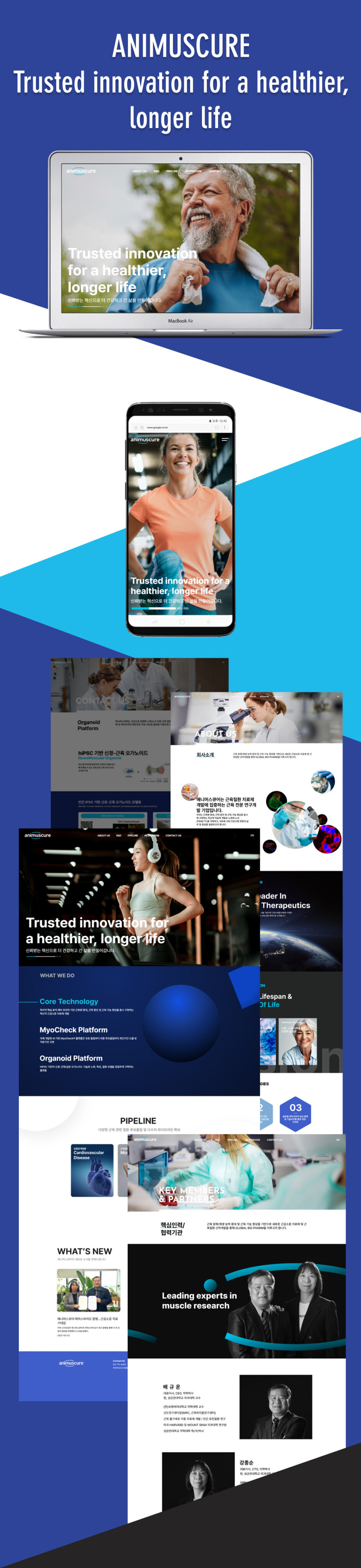 기존 웹사이트를 전면 리뉴얼하여, 근육질환 치료제 개발에 집중하는 근육 전문 연구개발 기업 애니머스큐어의 CI 리디자인을 반영하고 WordPress 기반에 UI 프레임워크 및 프론트엔드 라이브러리를 적용함으로써 글로벌 사용자에게 직관적이고 신뢰도 높은 브랜드 경험을 제공한 프로젝트입니다.